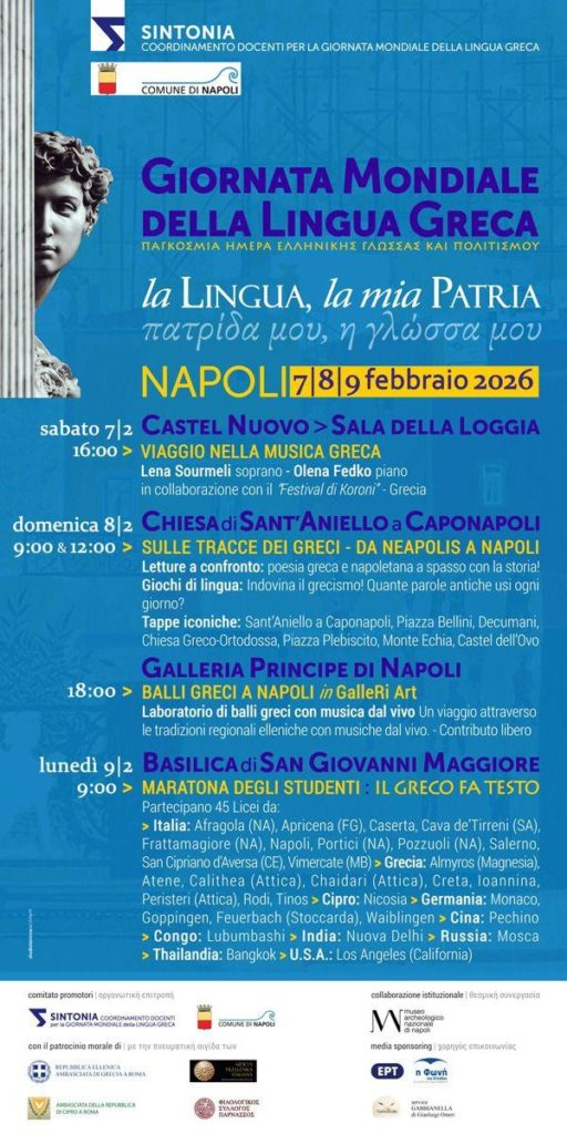 Naples and the Greece. An ancient bond that has been renewed for about ten years with an initiative conceived by Jannis Korinthios, former professor at the L’Orientale University of Naples (Modern Greek language and literature). It is World Greek Language Day (recognised by UNESCO), which is celebrated on the 9th of February.