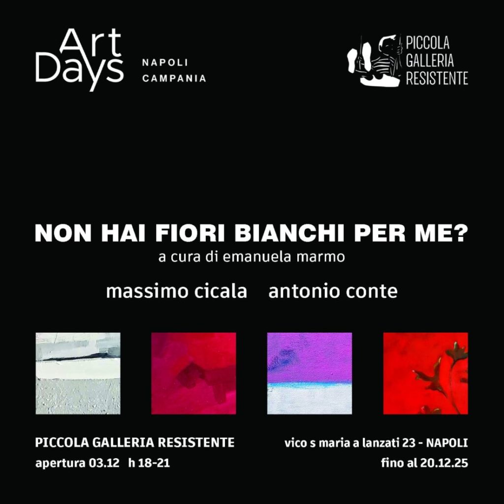 Non hai fiori bianchi per me? Parte da questo interrogativo la mostra (foto) di Massimo Cicala e Antonio Conte a cura di Emanuela Marmo che si inaugurerà mercoledì 3 dicembre alle 18 nell’atelier di Antonio Conte, sede della sua piccola galleria resistente, in vico Santa Maria a Lanzati 23, alle spalle di via Foria, arteria commerciale storica di Napoli, a pochi passi dal magnifico orto botanico.