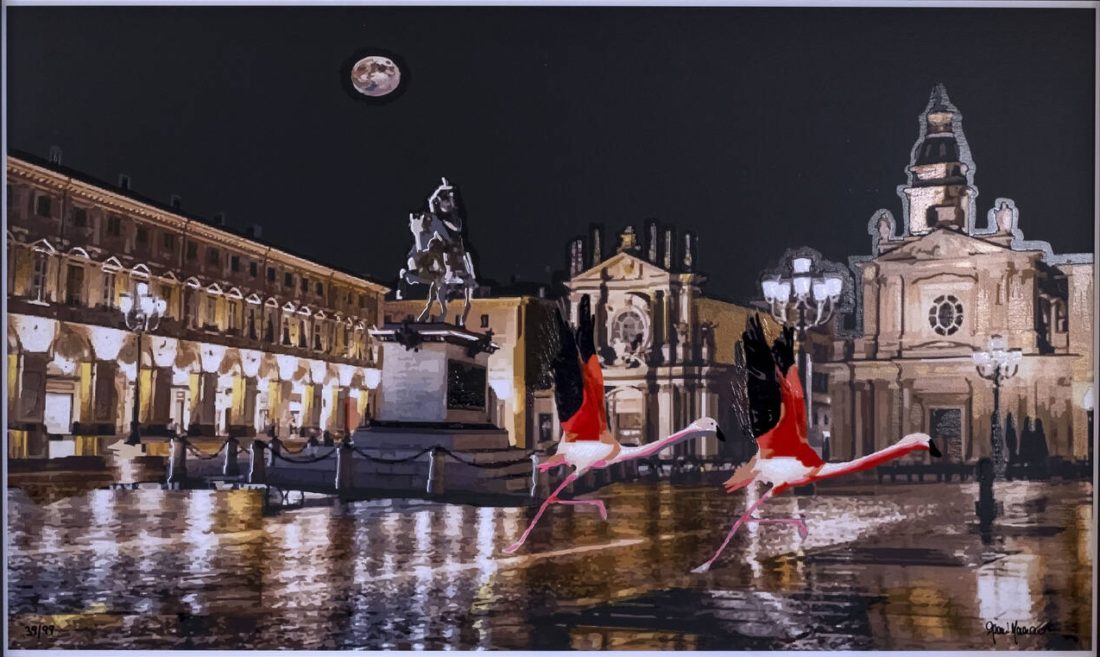 Moramarco, an artist from Turin born in 1957, is now fully immersed in the life of his time, in a cultural and social existence devoted to the technological world. From canvas and acrylics, he moves on to the technique of the optical pen and graphics tablet, with an eye to Canaletto’s camera obscura: he inserts backgrounds, positions characters, creates sections and, above all, plays with the combination of colours taken from the infinite chromatic universe of tones and shades.