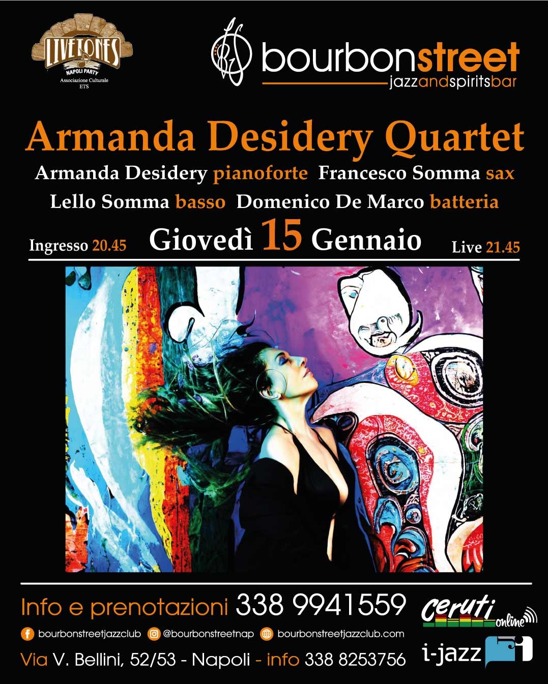 Armanda Desidery Quartet al Bourbon Street Jazz Club in via V. Bellini 53. Giovedi 15 gennaio 2026 per il Live Tones Napoli un concerto misto di colori e suggestioni.