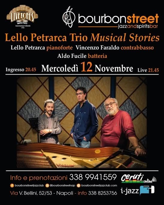 On stage, Musical Stories with the Lello Petrarca Trio: Lello Petrarca on piano, Vincenzo Faraldo on double bass, and Aldo Fucile on drums.