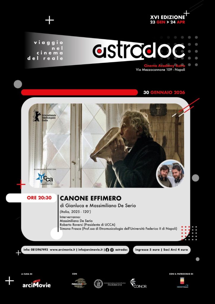 Canone effimero. Il documentario di Gianluca e Massimiliano De Serio sarà presentato domani, alle 20,30, nell’ambito di AstraDoc, la rassegna di Arci Movie dedicata al cinema del reale, nella sala di via Mezzocannone.