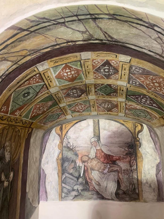 The reopening of the connection between the church of Saints Severinus and Sossio and the convent attached to it has brought to light, in the State Archives, a small chapel decorated with tempera on the wall. The painting, probably dated between the middle of the fifteenth century and the beginning of the sixteenth century, has in the foreground, on the central wall, the Pietà of Christ, while on the sides we find the two saints, probably referring to Saints Severinus and Sossio, with their initials still decipherable. The consolidation of the pictorial film, the structural reconstruction and finally the pictorial reintegration of the entire surface were carried out.