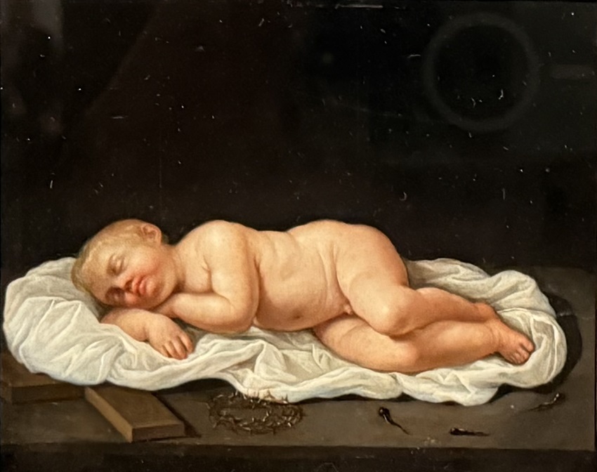 Gesù dormiente sulla croce (olio su lavagna). Opera tenera e meditativa, gioca sull’ambiguità simbolica tra sonno e morte. La croce e la corona di spine trasformano il riposo del Bambino in una prefigurazione del sacrificio, mentre i panneggi morbidi e la luce soffusa accentuano la dimensione intima del soggetto.