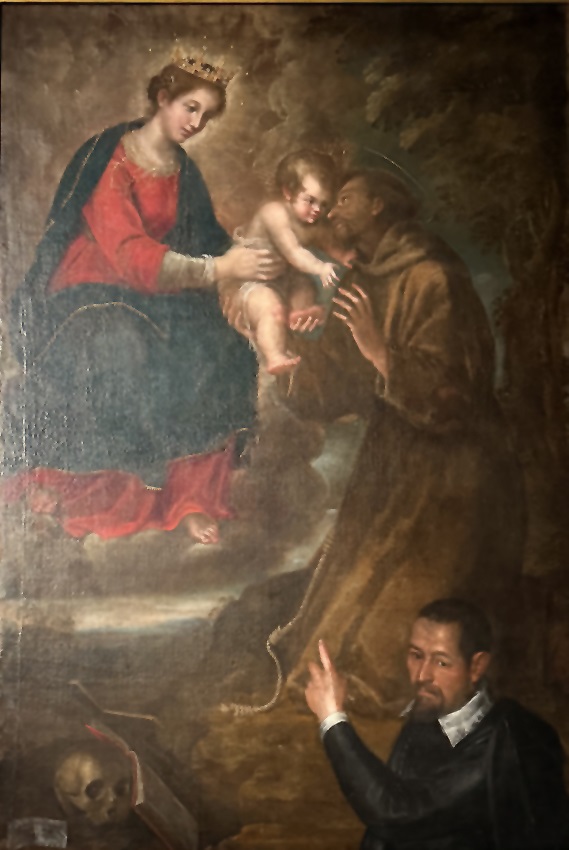 Nella parte alta del dipinto è raffigurata la comunione mistica: San Francesco è inginocchiato mentre la Madonna, sospesa in uno squarcio del cielo, porge il Bambino Gesù al santo, che si illumina nell’atto di accoglierlo tra le braccia. In basso, oltre a una veduta marina, compaiono i simboli di meditazione – croce, libro e teschio – e il ritratto del committente, che invita l’osservatore a partecipare all’evento. La gamma cromatica terrosa è ravvivata dal rosso della Vergine e dalla luminosità del Bambino, mentre l’abbraccio tenero tra Francesco e Gesù introduce un forte elemento sentimentale.