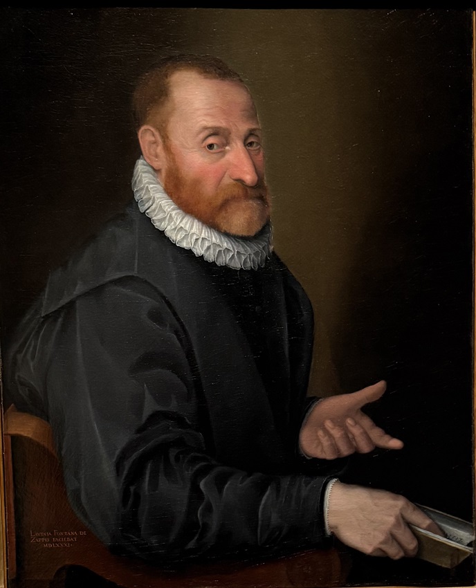 Entrambi gli intellettuali sono interlocutori del cardinale Paleotti[14], impegnato a rinnovare l’arte del tempo; la stessa pittrice sembra legata alla cerchia intellettuale che gravita intorno al prelato. In queste opere la pittrice abbandona il ritratto-teatro praticato dal padre Prospero Fontana per puntare all’essenziale: sfondo neutro, composizione sobria e nessun dettaglio che possa distrarre dalla resa fisiognomica e dalla profondità psicologica dei soggetti rispettando il messaggio promosso dal Paleotti. L’abbigliamento nero, prerogativa di letterati giuristi e accademici, non impedisce all’artista di mostrare la sua abilità nella resa preziosa delle stoffe e dei dettagli.