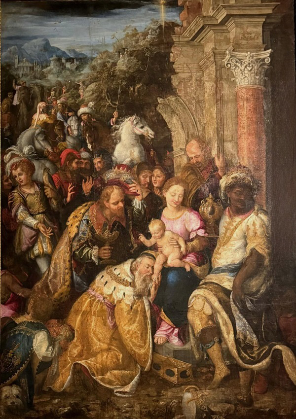 In primo piano compaiono la Madonna con il Bambino e San Giuseppe, sullo sfondo un antico edificio in rovina. Ai lati e di fronte i tre Magi; quello a sinistra è ritratto mentre si toglie il turbante e porge una coppa a navicella. Quello più anziano, posto sul davanti, ha vicino ai piedi uno scrigno di legno, con ai lati specchiature ovali, che contiene diverse medaglie; il suo turbante è sostenuto dal giovane paggio situato dietro di lui. Il Mago di destra di pelle nera regge un recipiente e guarda verso il basso. I Magi sono raffigurati con grande abilità: la struttura dell’impianto e la resa delle stoffe e dei colori conferiscono all’opera un’atmosfera di silenziosa perfezione e rigore compositivo.