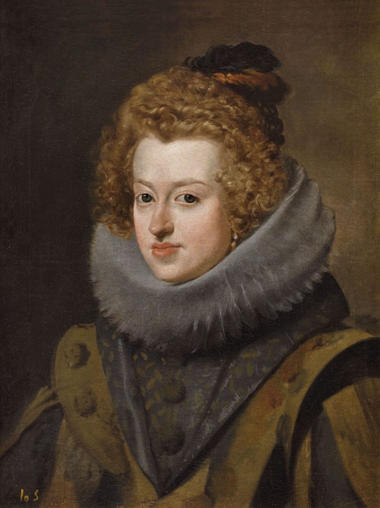 Nel ritratto dipinto da Velázquez, Maria d’Austria appare avvolta in un abito sontuoso, lo sguardo diretto verso lo spettatore, l’espressione seria e regale. Lo sfondo scuro e indefinito concentra l’attenzione sulla sua figura, mentre una luce soffusa accarezza il volto, creando un’atmosfera solenne e raffinata. La maestria del pittore emerge nella resa minuziosa dei tessuti e dei dettagli, che trasformano l’immagine dell’infanta in un ideale di bellezza aristocratica.