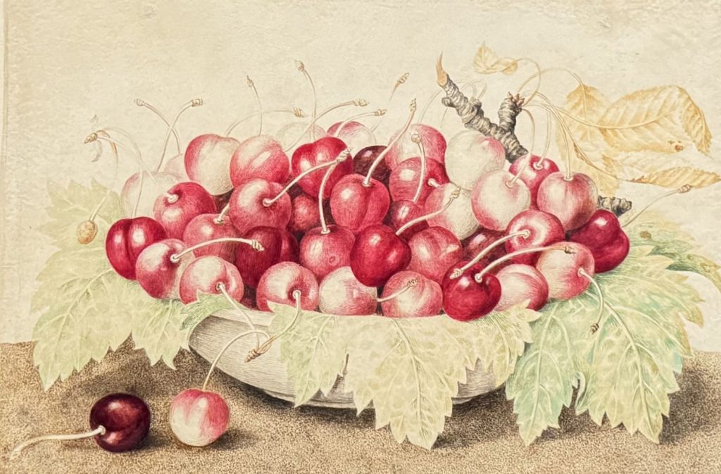 Nel Piatto di ciliegie, una scodella di terraglia colma di frutti poggia su foglie di vite; la luce modella la rotondità delle ciliegie con sottili tratti verticali, animando la composizione.