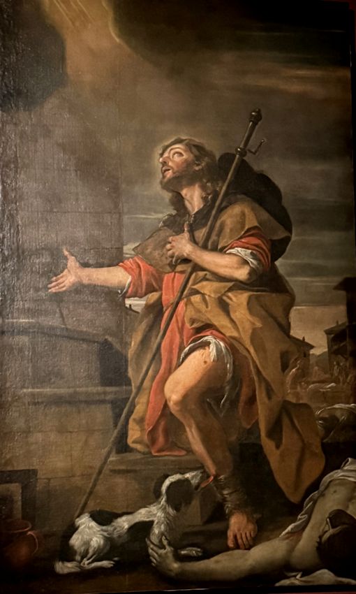 San Rocco, protettore contro la peste, è rappresentato con cappello da pellegrino, bastone e conchiglia, mentre il cane che gli lecca la piaga richiama il bubbone della malattia. Sullo sfondo si intravede il diffondersi del contagio.