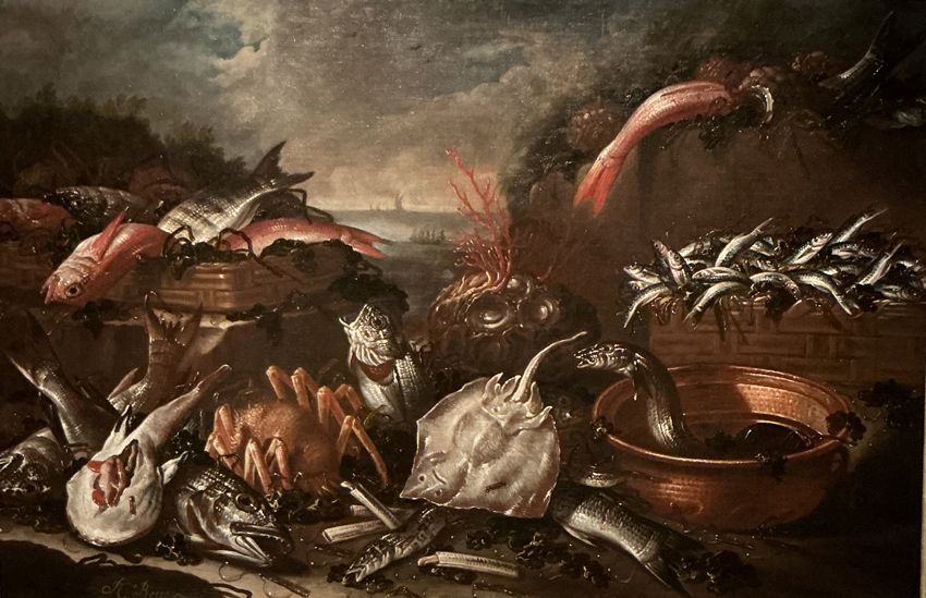 Nicola Massa Recco, figlio di Marzia Recco e di Antonio Massa, scelse di mantenere entrambi i cognomi per sottolineare la propria appartenenza alla famiglia Recco. Nella sua Natura morta con pesci e razze la lucentezza dei pesci restituisce l’umidità del mare, con riflessi argentei e azzurri che esaltano la freschezza delle squame e la torsione guizzante dei corpi.