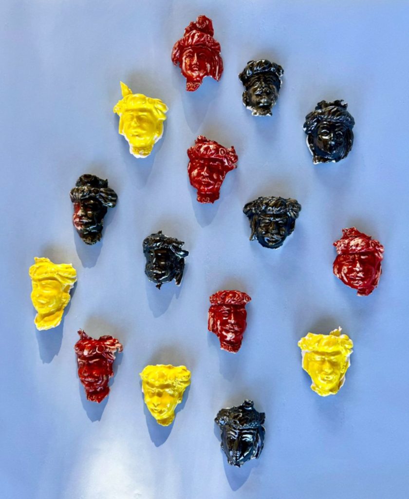 Accanto alle fotografie, Bramante presenta un nucleo di opere in ceramica, concepite come parte di un’installazione ambientale. Questo passaggio dal piano bidimensionale alla tridimensionalità introduce una nuova dimensione tattile e materica nel suo lavoro. La ceramica – fragile, modellabile e legata alla tradizione artigianale mediterranea – diventa corpo, presenza, oggetto affettivo.