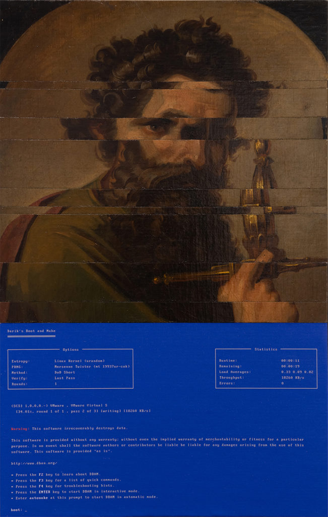 Nicolò Tomaini uses historical images to reconfigure them within imagined technologies: computer codes and reinvented digital languages rewrite the past as if the contemporary world were attempting to archive it and restore it through new