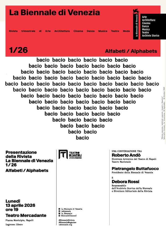 “Alfabeti / Alphabets”. Dedicated to the theme of the word, issue 1/2026 of the Venice Biennale magazine will be presented at the Teatro Mercadante on Monday 13 April at 7 pm.