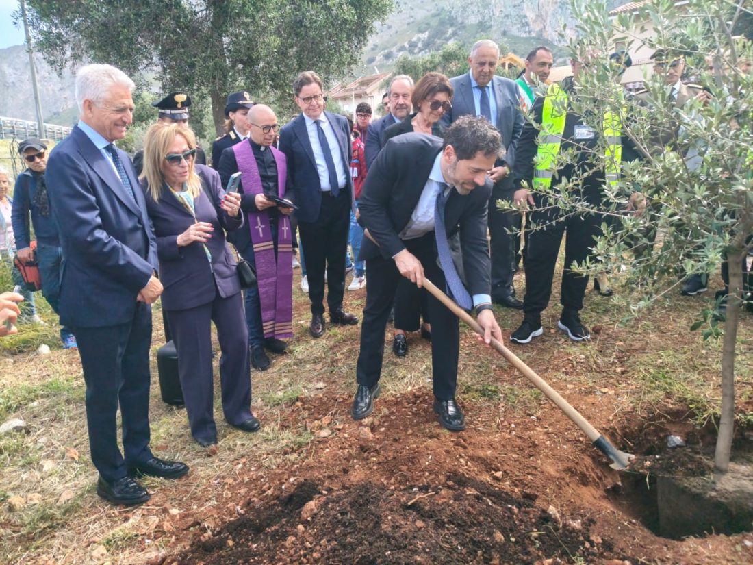 Giuseppe Salvia con il figlio, poco tempo prima di essere assassinato dalla camorra. In copertina, Claudio Salvia, esperto in materia di lotta al racket e all’usura alla Prefettura di Napoli, scava per piantumare un ulivo nel giardino della memoria di Capaci dedicato (da stamattina) a suo padre (foto sotto il titolo)