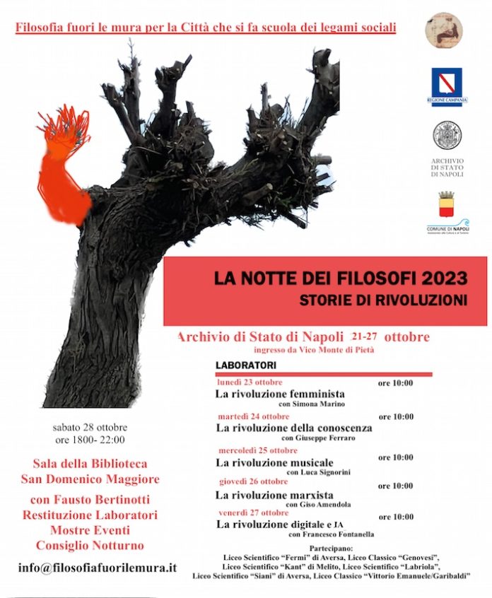 Storie di rivoluzioni. Ecco La notte dei filosofi edizione 2023.Quest’anno durerà una settimana e si svolgerà i due sedi. All’Archivio di Stato di Napoli domani, sabato 21 ottobre alle ore 10 conferenza di apertura e presentazione dei cinque laboratori per le scuole che si terranno dal 23 al 27 ottobre.