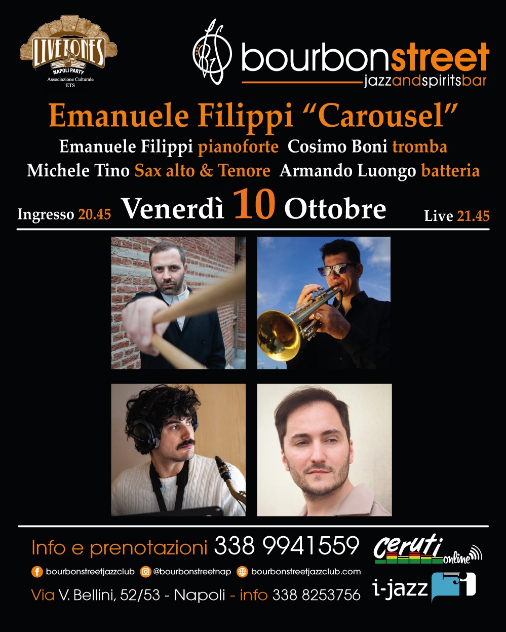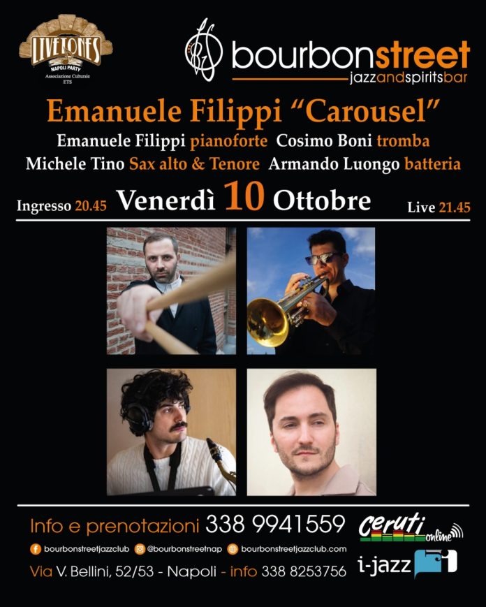 Sul palco alle 21.45: Emanuele Filippi con “Carousel”: accanto a lui, Cosimo Boni (tromba), Michele Tino (sax alto & tenore), Armando Luongo (batteria).