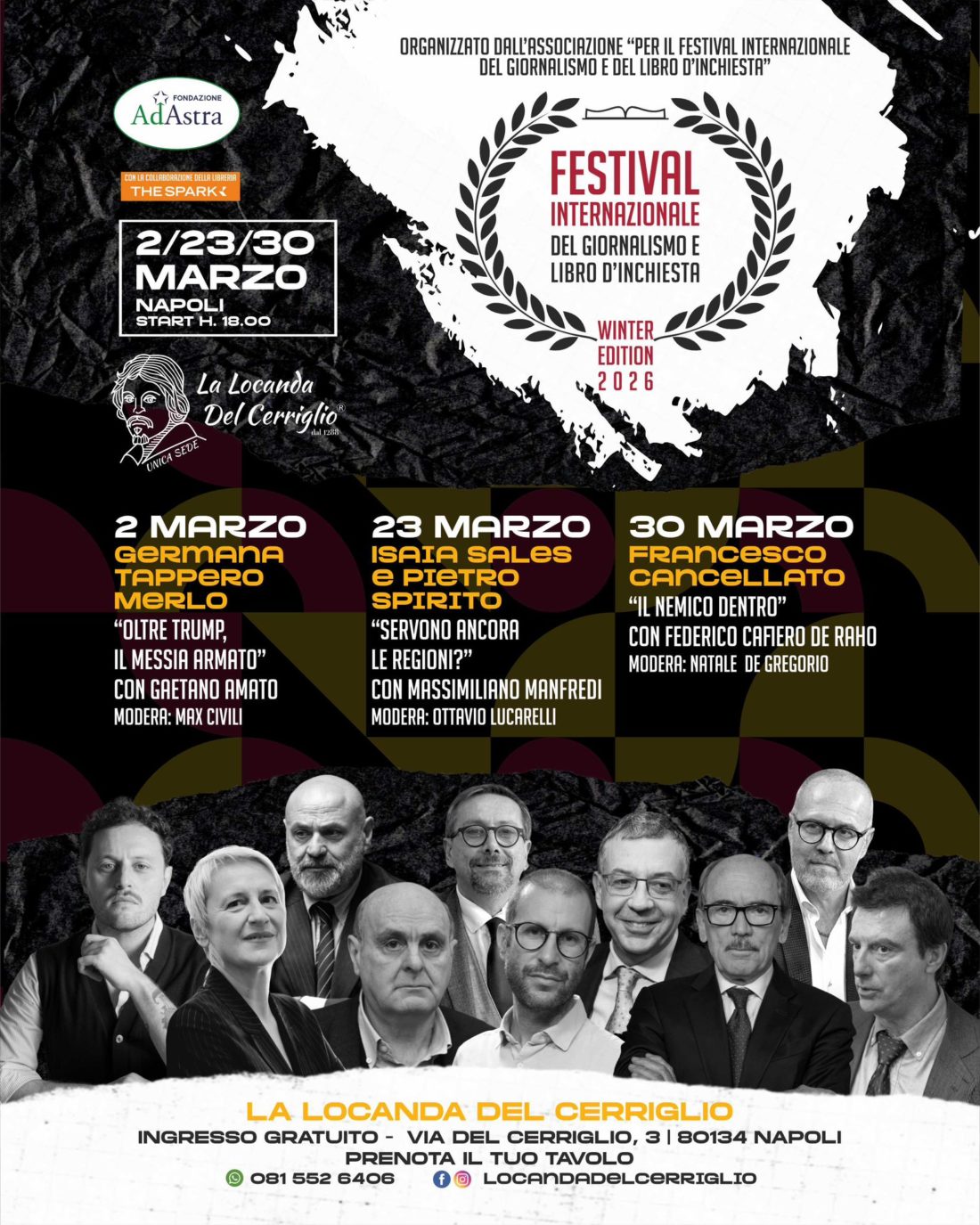 Non poteva mancare la politica del presidente Trump tra i temi del festival internazionale del giornalismo e del libro d’inchiesta. Di lunedì (alle 18) tre appuntamenti, dal 2 al 30 marzo, torna, con la sua quarta edizione la manifestazione ospitata dalla storica locanda napoletana del Cerriglio che accolse Caravaggio.