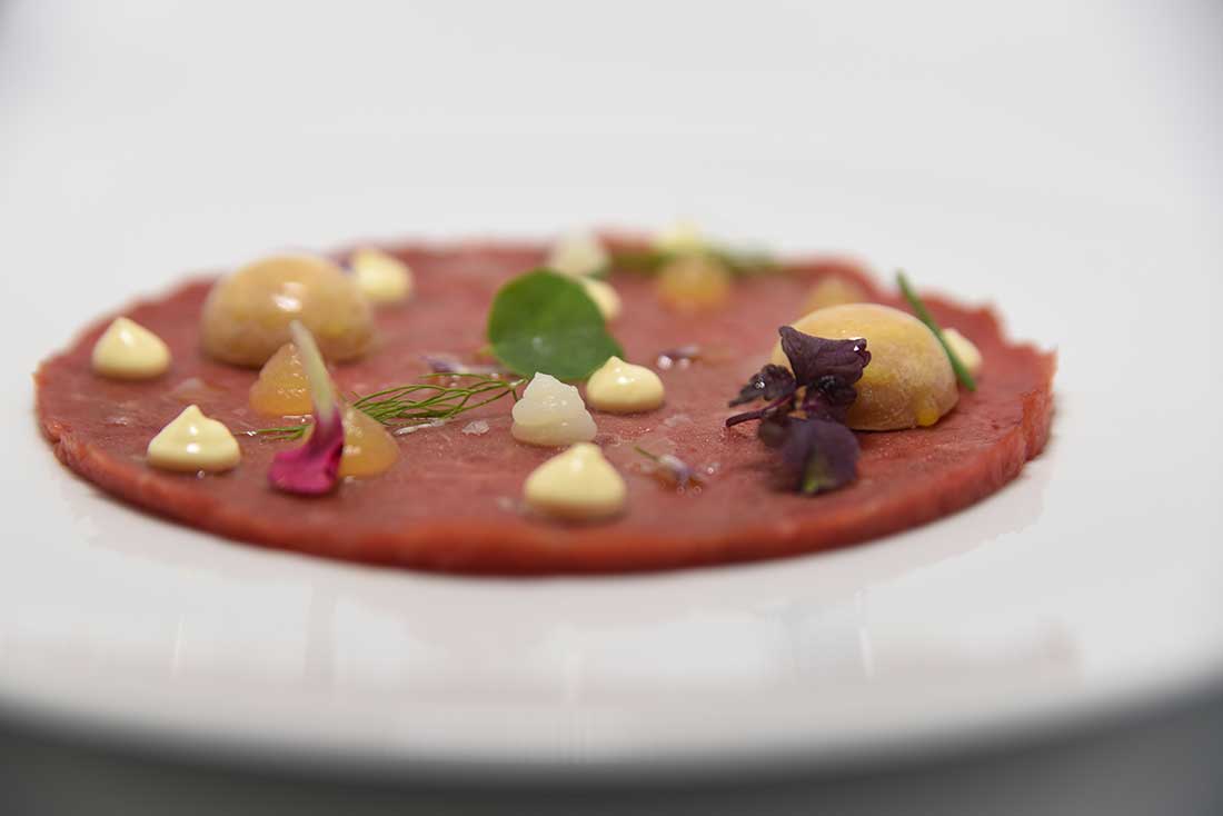 Tra le specialità proposte nel menù: il battuto di manzo con foie gras, gel di agrumi e mayonese di senape, gli gnocchi con salsa di peperoncini verdi, crudo di gamberi rossi, aglio nero di Voghiera, gli spaghettoni alla Nerano con sashimi di capasanta, il petto d’anatra con marmellata di kumquat, cipollotto nocerino alla griglia e asparagi croccanti, il tiramisù rivisitato con choco ball al cioccolato fondente, crumble al savoiardo, spuma al marsala, caffè espresso.