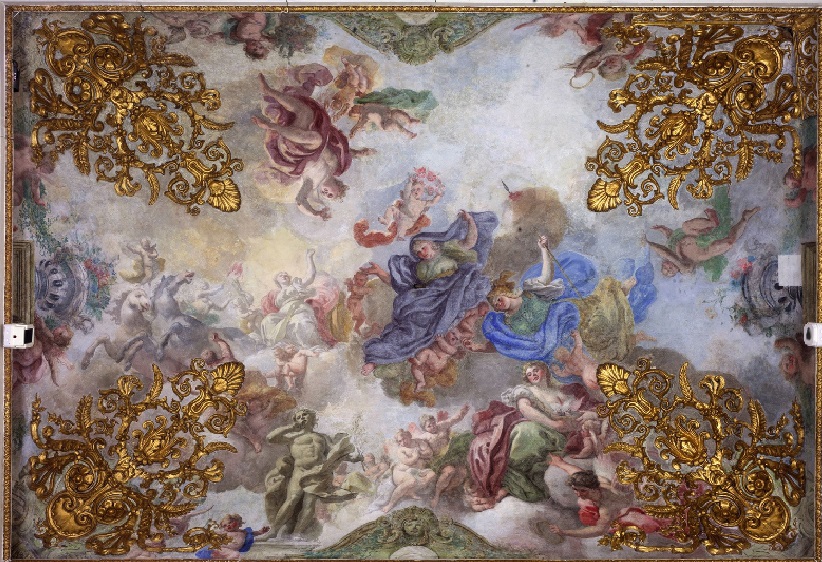 [2] L’affresco riportato alla luce è opera documentata di Nicola Maria Rossi (1690-1758), che secondo documenti fu pagato nel 1739 cinquecento ducati per dipingere a fresco nell’Alcova di S. M. la Regina “un augurio di felicissima prole”.