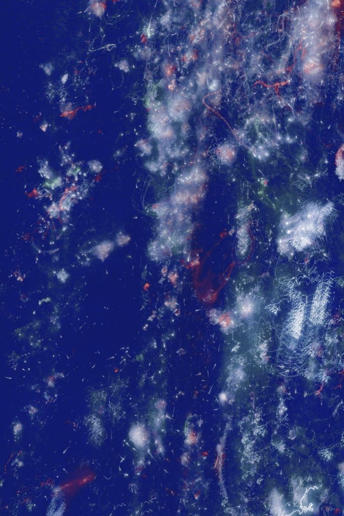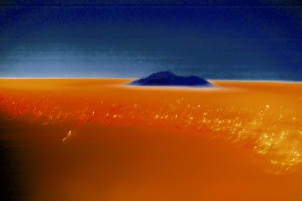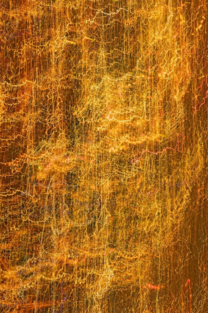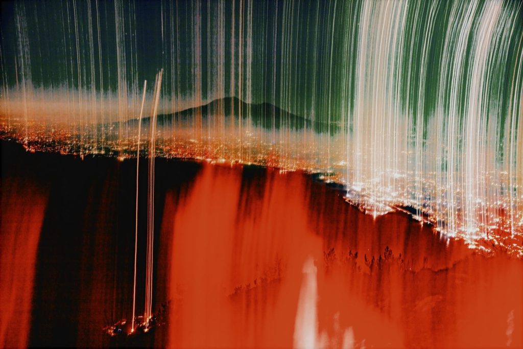 In alcune immagini si riconosce la sagoma del Vesuvio; in altre dominano scie luminose, arabeschi e campiture di colore che invitano a riflettere sul rapporto tra realismo e astrazione. Le fotografie, realizzate attraverso tempi di esposizione e movimento della camera, assumono una dimensione pittorica: la luce diventa linguaggio e trasforma l’evento in dipinto.