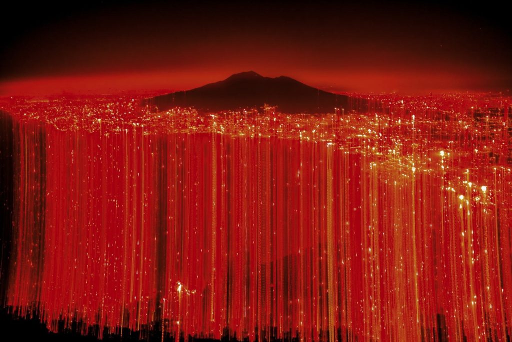 Questa dimensione emerge con particolare intensità in una delle immagini più significative di Mario Amura: il Vesuvio appare come una presenza silenziosa e immobile, ridotta a sagoma, mentre la città circostante esplode in traiettorie luminose che sembrano sottratte al tempo presente. L’immagine restituisce l’idea di una Napoli che, per un istante, rende visibile la propria energia interiore.