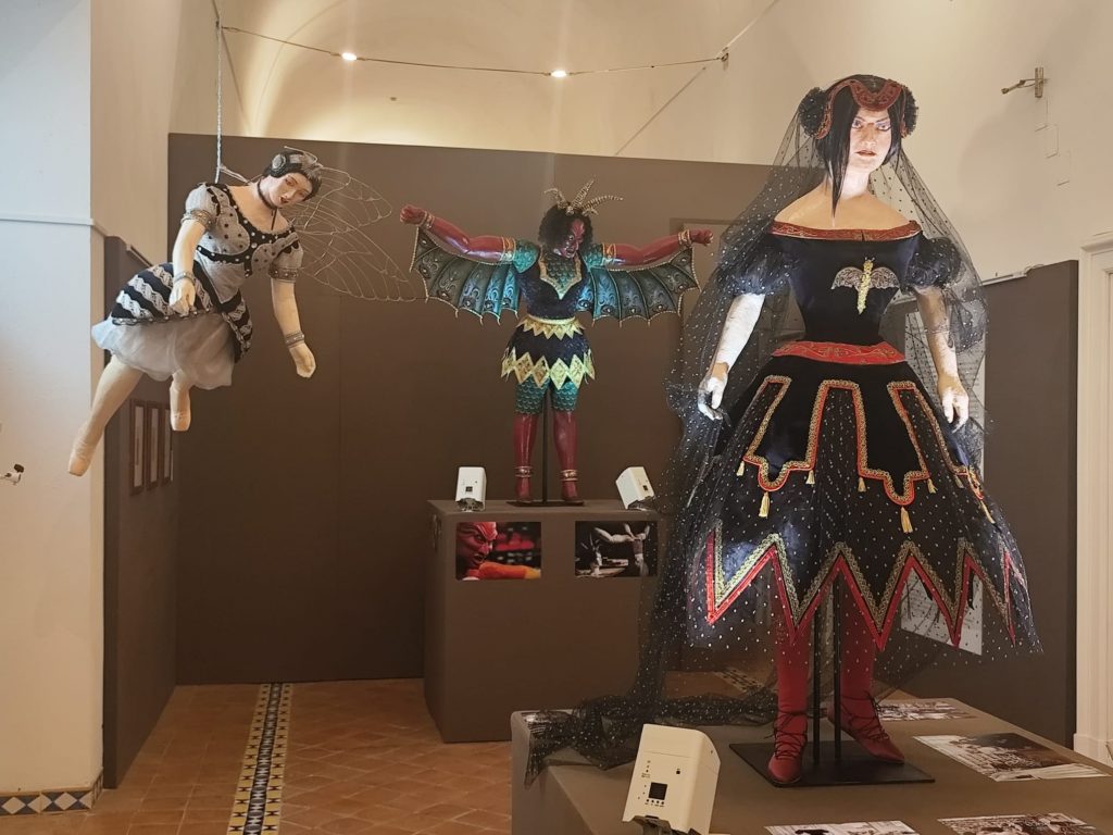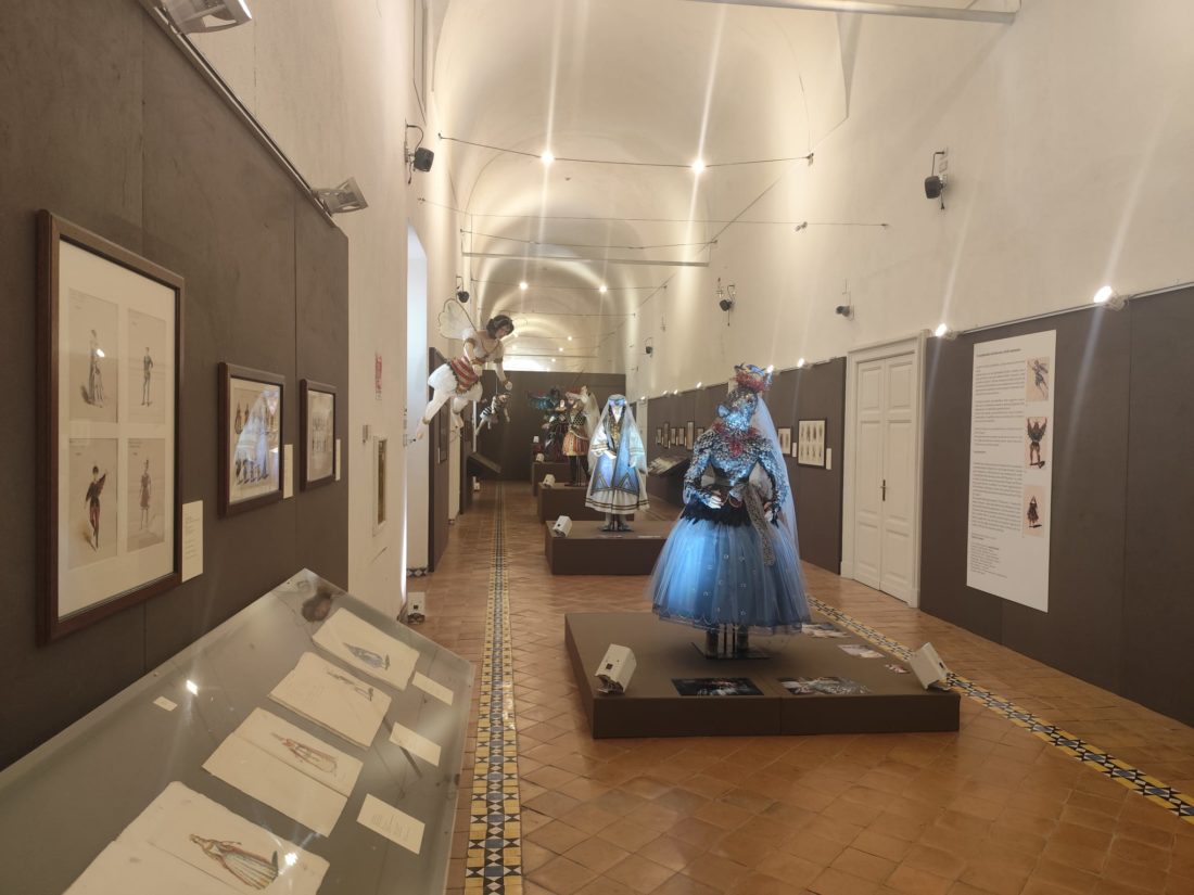 Il nucleo importante dell’esposizione è rappresentato, infatti, proprio dai costumi di scena ispirati a una selezione di figurini curata da Odette Nicoletti con Luigi Benedetti, esposti su manichini, con approfondimenti dedicati ai materiali e alle tecniche utilizzate.