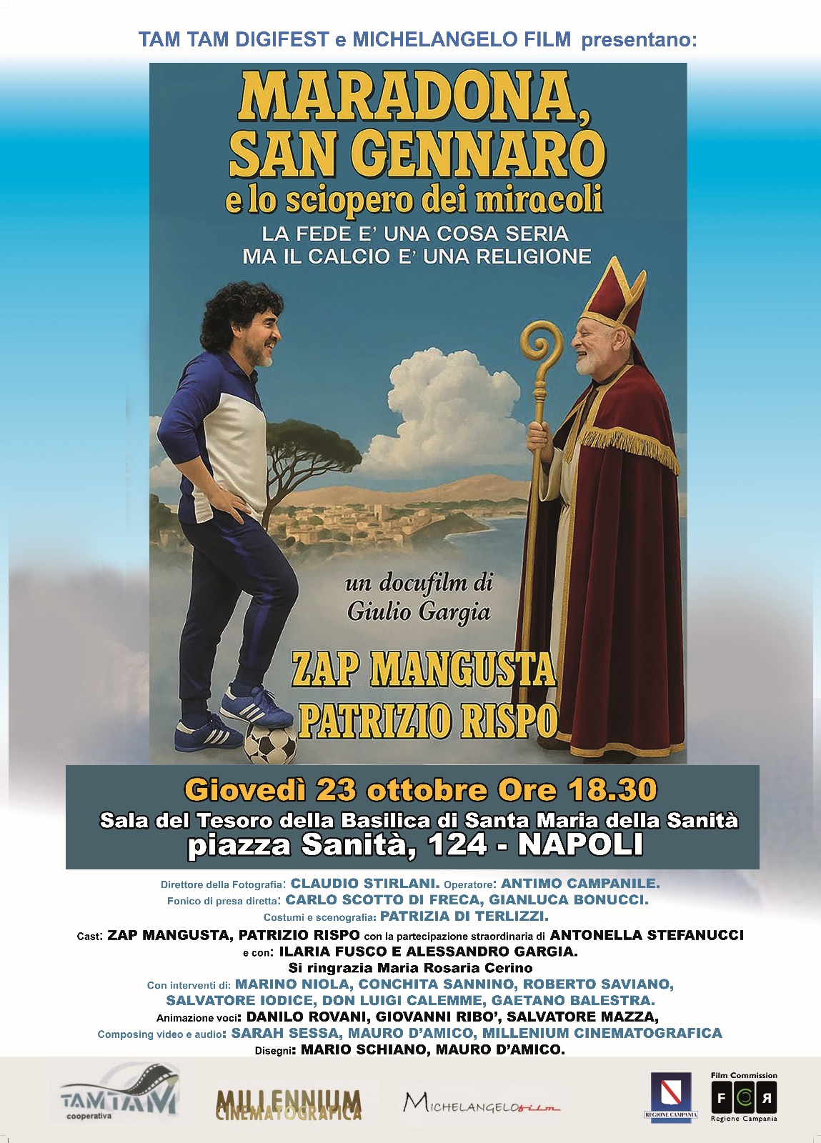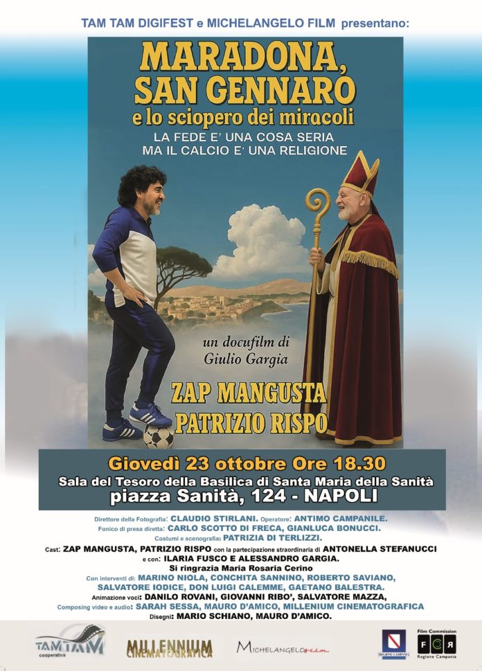 Giovedì 23 ottobre, nella sala del tesoro della Basilica di Santa Maria della Sanità, alle 18.30, si propone il film Maradona, San Gennaro e lo sciopero dei miracoli di Giulio Gargia prodotto dalla Cooperativa Tam Tam in associazione con Millennium Cinematografica e Michelangelo Film.