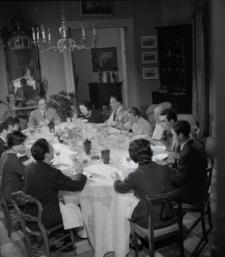 Sabato, domenica e lunedì (stagione 1959-1960), 2 atto: da destra Eduardo, Nina De Padova, Pietro Carloni, Pupella Maggio, Enzo Petito, Carlo Lima, Tonio Sirabella, Regina Bianchi, Antonio Casagrande, Elena Tilena, Gennarino Palumbo, Graziella Marina. In copertina, Sabato, domenica e lunedì (stagione 1959-1960), 3 atto: Eduardo e Pupella Maggio