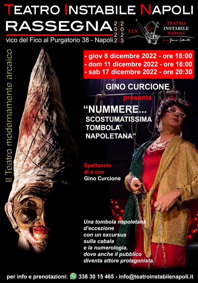 Non c’è Natale a Napoli senza “Nummere”. Gino Curcione arriva con la sua immancabile scostumatissima tombola, domani, giovedì 8 dicembre, ore 18.00, domenica 11 ore 18.00 e sabato 17 dicembre ore 20.30 al Teatro Instabile Napoli , in vico Fico Purgatorio ad Arco, 38.