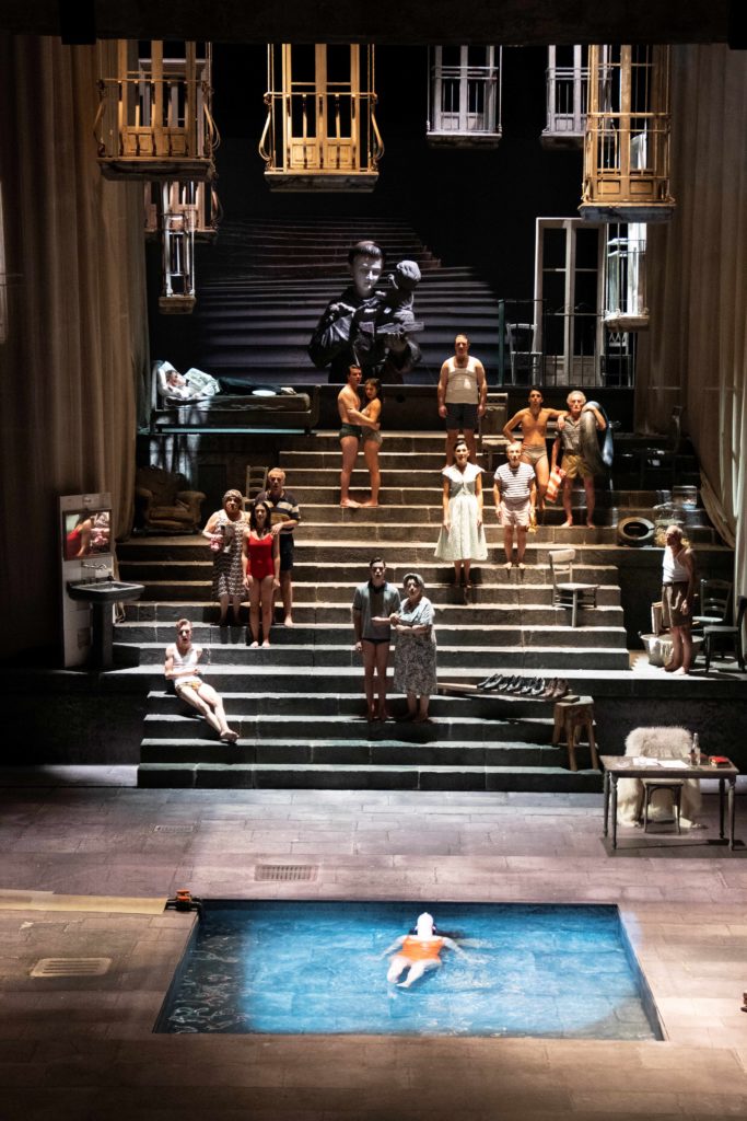 Partiamo dalla sontuosa elegante scenografia. Un’affascinante “rariata” dei vicoli di Toledo fatta di “Saittelle” balconi sospesi, sedie fuori dai bassi, pianino, una bancarella di scarpe usate ‘a ciente lire ‘o pajo, due vetrine che ricordano la Standa dove i manichini prendono vita, diventando silhouette o due Babbi Natale, in fondo allo scalone si erge una statua di Sant’Antonio con il Bambino, una grande vasca contornata da sedie a sdraio che vuole ricordare i Bagni Eldorado, dove coppiette, scugnizzi, anziani prendono vita ballando, bagnandosi nelle acque antiche di Napoli, uno scrittoio che ricorda l’autore impegnato a rincorrere i suoi sogni, le sue gioie e dolori, il suo essere affascinato da racconti di “spiritilli” e anime vaganti… la sua scrittura.