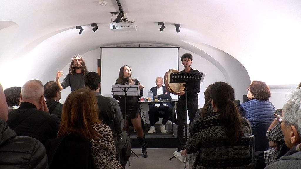 Vittorio Borrelli, Dario Mauro e Marcella Tufano, infatti, hanno aperto l’incontro proponendo al numeroso pubblico presente, accompagnandosi con nacchere e tammorre, un primo stralcio della preghiera che Ferro in questo testo fa pronunciare da un personaggio surreale e suggestivo, Susumella, ultracentenaria, donna saggia, attraversata da dolori profondi, che rappresenta la memoria arcaica di Napoli, espressa in un linguaggio antico, stratificato, identitario.