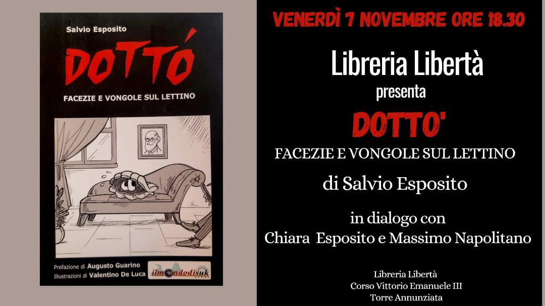 Arriva alla libreria Libertà di Torre Annunziata domani, venerdì 7 novembre, alle 18.30, il libro “Dottó” di Salvio Esposito edito da ilmondodisuk. L’autore ne parlerà con il giornalista Massimo Napolitano e la psicoterapeuta Chiara Esposito.